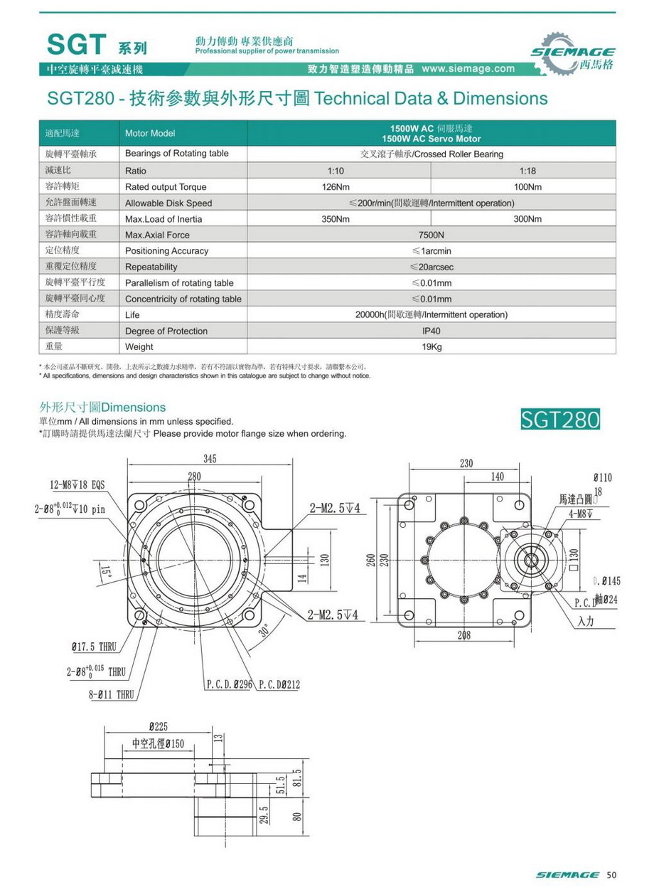 中空平臺(tái)減速機(jī)SGT280,siemage中空平臺(tái)減速機(jī)可配各品牌1500W伺服電機(jī),伺服馬達(dá),各廠家86型步進(jìn)馬達(dá),110步進(jìn)電機(jī)。減速比有1:10,1:18等。